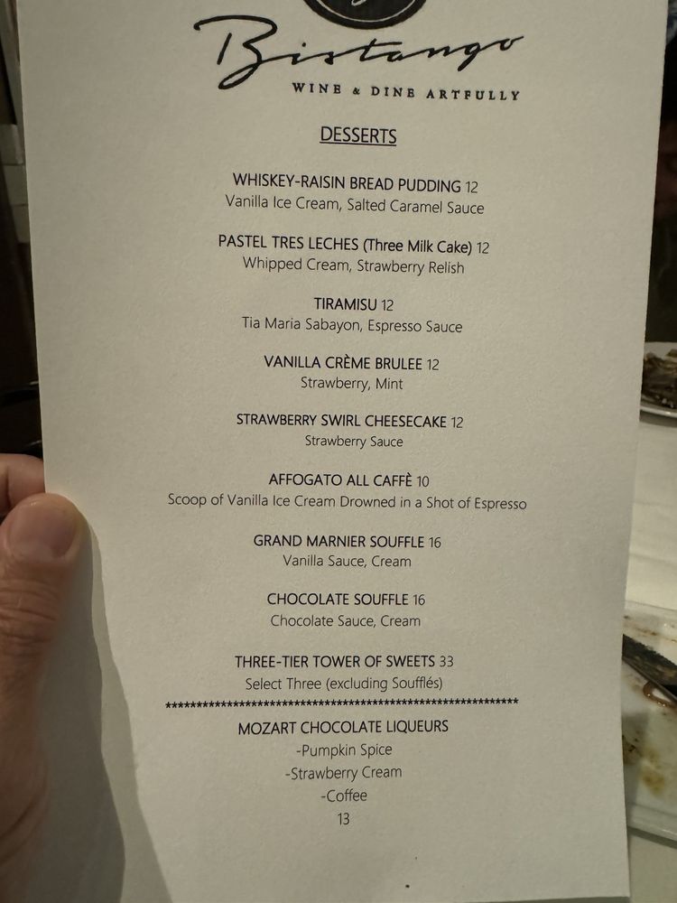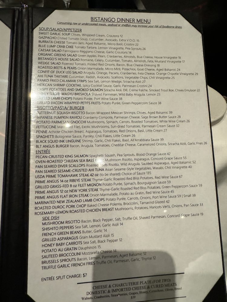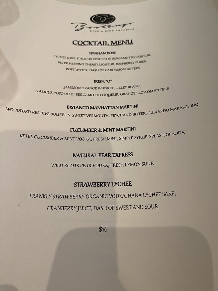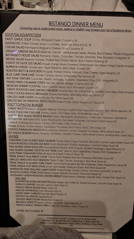 Bistango is a stylish restaurant located in Irvine, CA, offering a diverse menu of salads, New American cuisine, and an extensive wine selection. The restaurant boasts a range of amenities, including outdoor seating, classy ambiance, and valet parking. The appetizers feature dishes like Mexican Shrimp Cocktail and Tuna Tartar, while the salads and soups showcase unique options like Spanish Octopus Salad and Wedge Salad. The pasta section offers indulgent options like Wagyu Beef Ravioli and Risotto with bacon-wrapped prawns. Customer reviews praise the food quality and service, with mentions of delicious dishes like Japanese pumpkin ravioli and pan-seared scallop Risotto. Overall, Bistango provides a sophisticated dining experience with a diverse menu, making it a must-visit for food enthusiasts looking for a memorable meal.